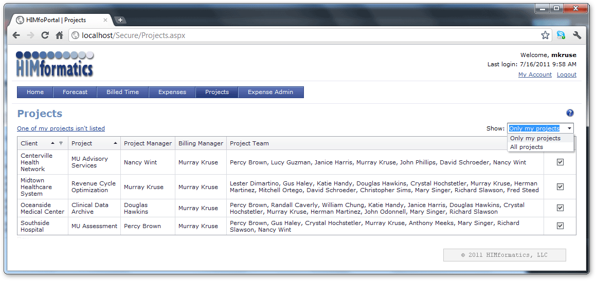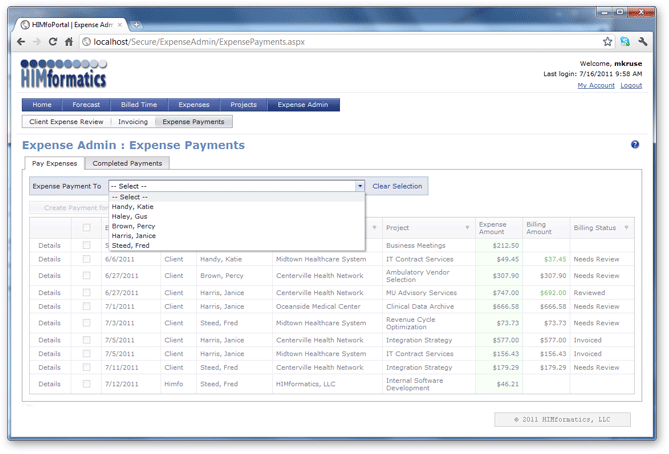 Another area of focus for HIMfoPortal was entry, tracking and reporting of expenses. Our consultants incur both internal and client expenses. HIMfoPortal's expense features were designed so that employees could easily submit expense reports and track their progress in the reimbursement process. In addition, HIMfoPortal enables Project Managers to monitor, approve and create client invoices for these expenses. (Note: at the time of this writing, the expense features of HIMfoPortal are still under development. Therefore, this case study does not directly address expense-related features).