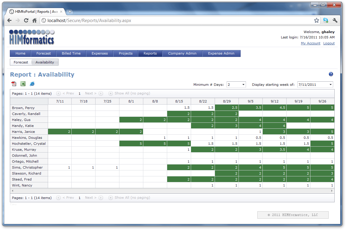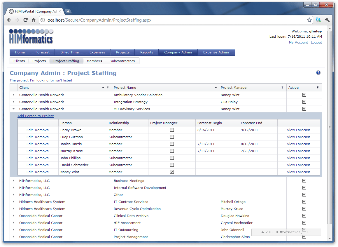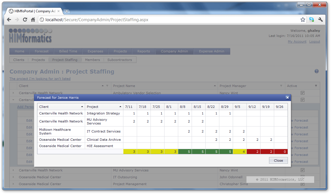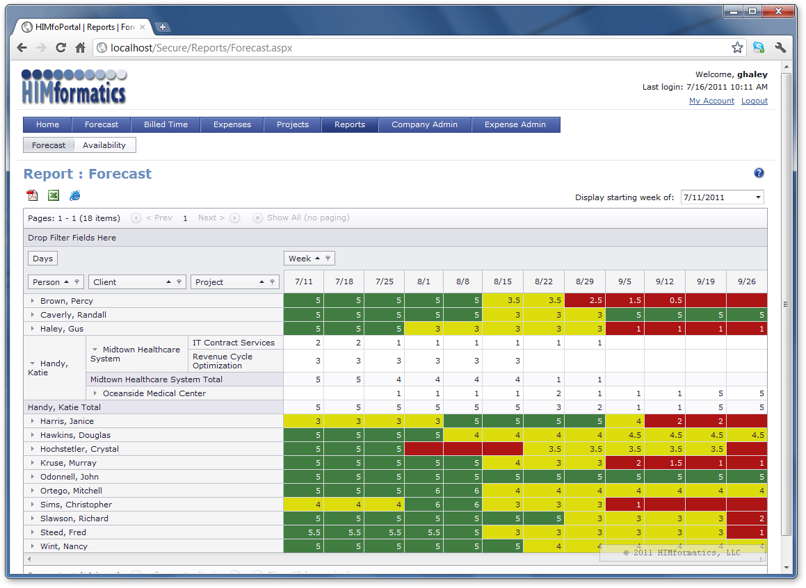 One of the key challenges of managing a consulting firm is forecasting resources (i.e. people) and projects. Therefore, one of the primary goals of HIMfoPortal was to provide an easy-to-use tool for forecast entry and reporting (described in greater detail below).
