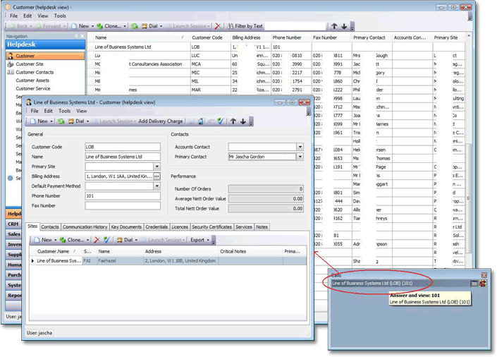 The following example image demonstrates integration with TAPI with the ability to dial out and answer / "pop" incoming client details. Note the call popup is a normal WinForms window.