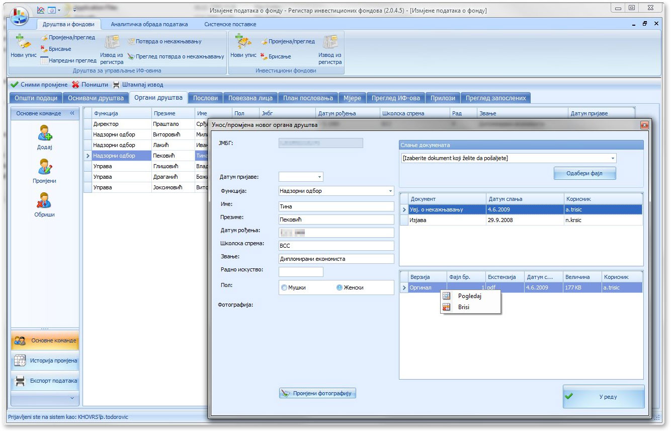Screenshot of a data-entry application, showing entry of new board of director member, for an investment fund management company, listed on Banja Luka Stock Exchange