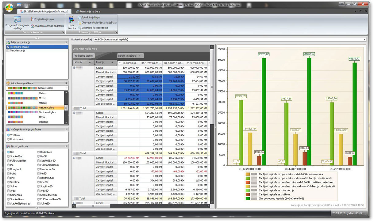 Surveillance of trading was just one of the goals, the other being a financial report analysis module. All reports gathered via the E.P.I. are later processed by the Commission’s employees, in order to identify and analyze trends, state of the capital market, financial performance of participants, or to find any irregularities in financial reporting, which could trigger legal consequences. By using the Data Grid, Pivot Grid, and Chart controls, the development team was able to produce an analysis system within a couple of months, which, as mentioned previously, covered more than 150 different structured reports.