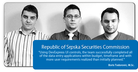 The Republic of Srpska Securities Commission is the financial services regulatory body of the Republic of Srpska (RS), a political entity within the state of Bosnia and Herzegovina. RS has established its own stock exchange (Banja Luka Stock Exchange) and set some high-level goals for the RS Securities Commission: improve transparency by publishing various data on the Web, gather and exchange data among capital market participants, develop surveillance over stock exchange trades - in order to identify and analyze trends - develop effective and efficient capital market, further develop the country’s economy, and identify any attempts of malicious activities, as identified in the European Union Market Abuse Directives. Since the stock exchange and capital market formation in the early 2000’s, there has been a strong movement towards developing relevant laws and regulations. However, late in 2006 the main focus was shifted towards the development of an integrated information system, which would bring many benefits of ICT to the capital market. The RS Securities Commission formed a development team consisting of a project manager/lead developer, B. Todorović M.Sc., UX/developer/analyst/designer Z. Skakić and developer/analyst G. Vasilić, Professor of Mathematics.