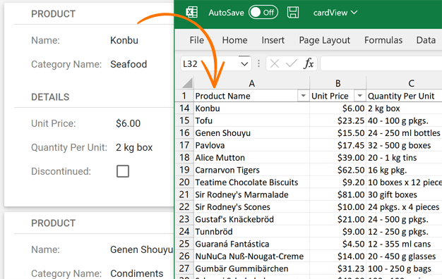 Our ASP.NET WebForms/MVC CardView can display a toolbar with data export commands. Rich client-side and server-side data export API allows you to export cards to a file or stream as and when needed.
