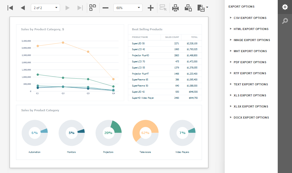 Preview and print report documents using DevExpress Report Viewers and export data to a variety of custom file formats (PDF, DOCX, RTF, XLS, XLSX, TXT, MHT, CSV, HTML, and multiple image formats including SVG). Use our intuitive End-User Report Designer to incorporate runtime report customization in your next web project or give your end-users the ability to create ad-hoc/custom reports within any modern web browser.