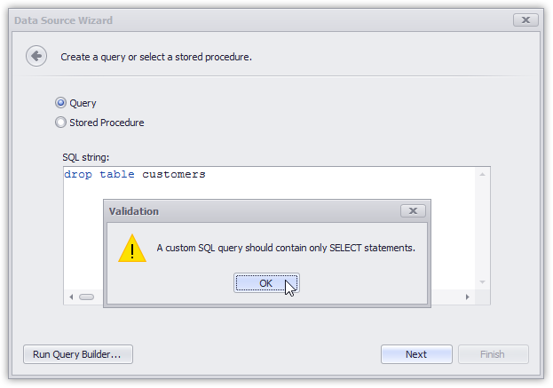 Once again, validation restricts SQL commands to SELECT statements. If it fails, the DevExpress.DataAccess.Sql.CustomSqlQueryValidationException exception is thrown.