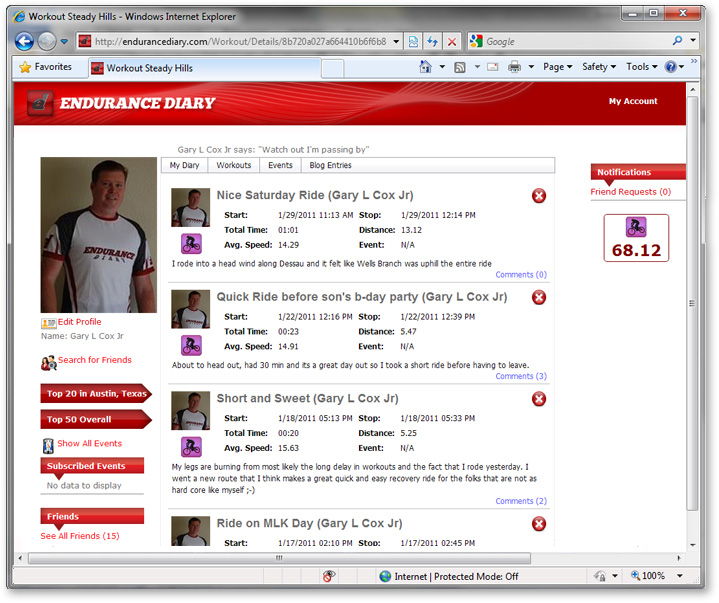 Endurance Diary was built using ASP.NET MVC. During the design process for the site we looked at the controls available from other vendors and in the end we chose to use the DevExpress MVC Extensions hands down. DevExpress Controls allow us to create a rich web experience for our users. With features including themes and support for client-side/server-side interaction as well as consistency of the code within controls (ClientSideEvents, Settings, Properties, etc) and great performance it was a no brainer to use their controls for our site. In the center section of the screen capture below there is a diary feed along with comments. This section uses the DevExpress MVC Extension Grid Control. Above the feed we use the DevExpress Menu control; we really liked the Glass theme and how well it looked within our overall site theme. The buttons, like the Comment button below, are much better in appearance than the standard buttons used within web development and so we chose to use those as well. To right we are using a DX Callback Panel which checks every 3 minutes if any new Notifications have been sent to you.