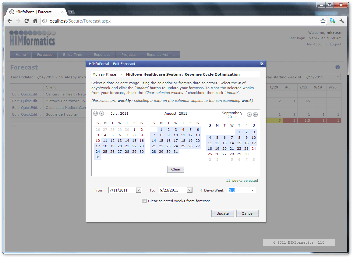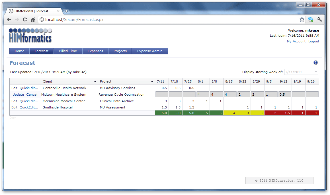 One of the key challenges of managing a consulting firm is forecasting resources (i.e. people) and projects. Therefore, one of the primary goals of HIMfoPortal was to provide an easy-to-use tool for forecast entry and reporting (described in greater detail below).