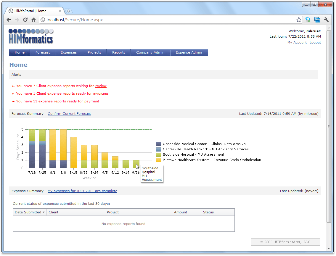 Another area of focus for HIMfoPortal was entry, tracking and reporting of expenses. Our consultants incur both internal and client expenses. HIMfoPortal's expense features were designed so that employees could easily submit expense reports and track their progress in the reimbursement process. In addition, HIMfoPortal enables Project Managers to monitor, approve and create client invoices for these expenses. (Note: at the time of this writing, the expense features of HIMfoPortal are still under development. Therefore, this case study does not directly address expense-related features).