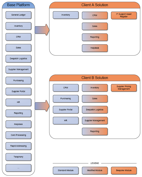 In order to meet its goals, it was clear that there was a requirement for a base platform comprising a repository of reusable modules that could be assembled to form the bulk of each implementation with modifications and additional modules completing the bespoke client solution. The following schematic illustrates this.
