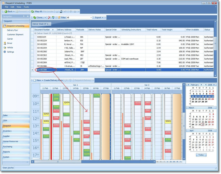 Unscheduled sales orders can be dragged onto the vehicle delivery schedule as required.