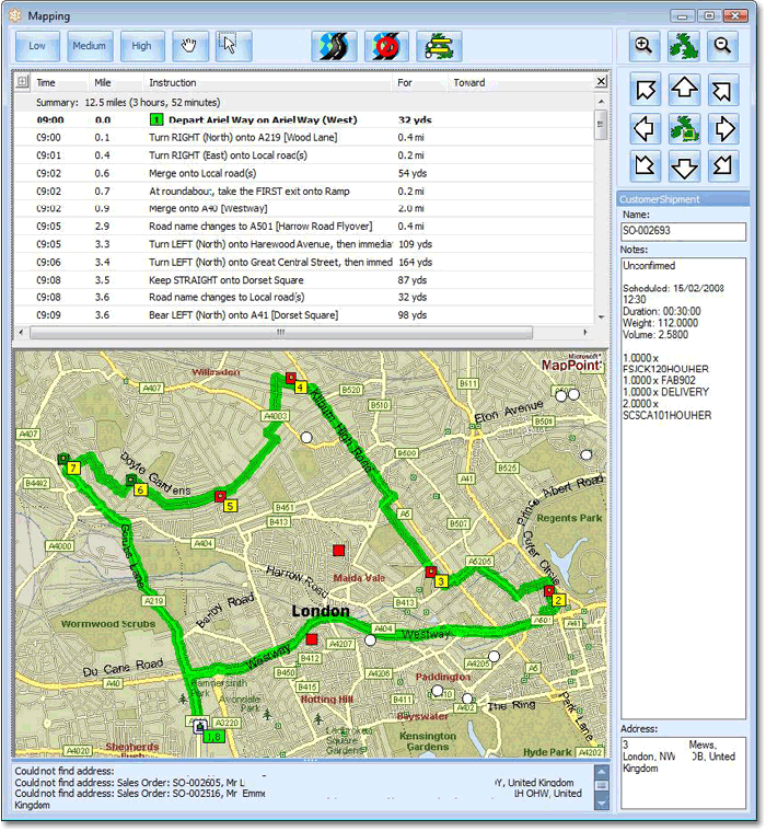 Integration with Mappoint allows the user to view and sanity check vehicle routes and provide drivers with routing information if required.
