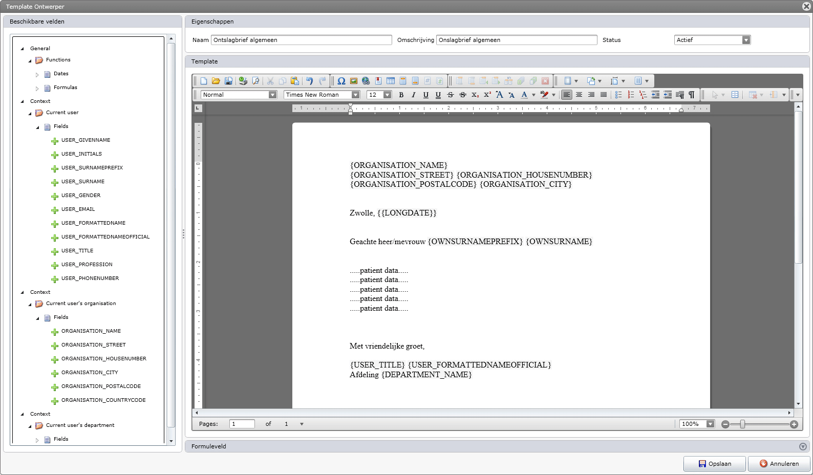 Sometimes information stored in an electronic health record needs to be sent to the patient’s personal physician. To facilitate that, Medistration offers a Correspondence Template Editor. This editor allows users to design letters which hold specific medical information and additional text where needed. We used DevExpress Rich Text Control to create this editor, as can be seen in the following picture: