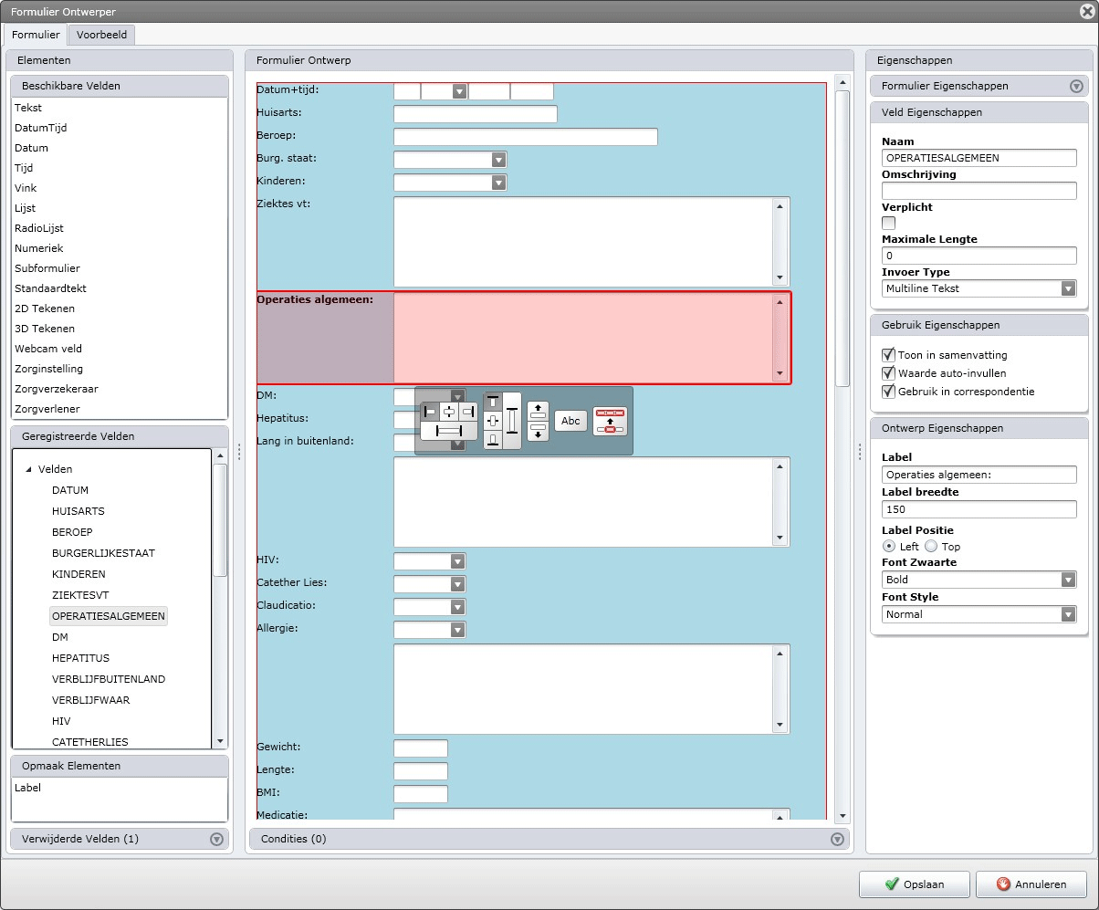 As you can imagine, specific information is recorded within specific medical clinics and situations. This means our software solution needs a way for clinics to dynamically specify the kind of information they wish to record. To accommodate this, Medistration offers an advanced Form Designer, with which users can design their own specific forms to use in specific medical situations. In addition, users can add business logic to be performed within these forms, like computing a Body Mass Index based on the patient’s weight and height. The following picture shows the Form Designer in action: