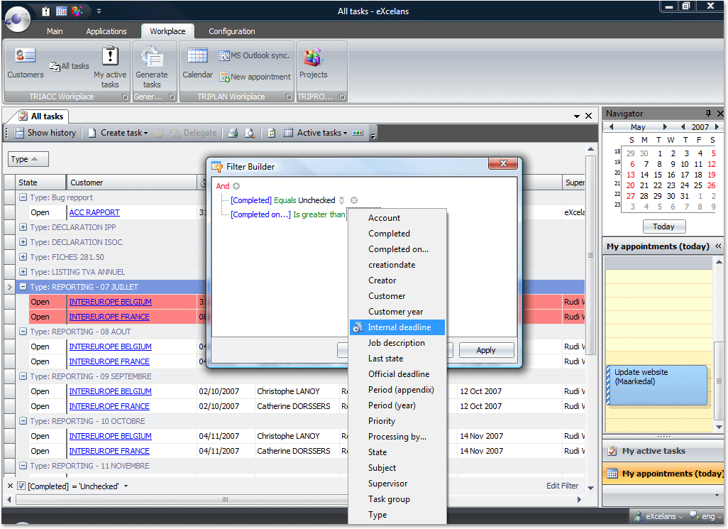 TRIACC, is a task-based management tool for accountants. This module allows predefining tasks, and binding these tasks to workflows. The deadline of these tasks can be a fixed date, or can be calculated based on variable elements like the closure date or general meeting date of the customer. The basic idea is to give management the power to quickly overview the outstanding tasks and to manage the workload of its personnel.