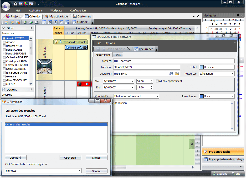 A second module is TRIPLAN that offers an Microsoft® Outlook®-like calendar that allows the users to register their appointments, create meetings with several users or simply check another users' planning. The system also allows creating other resources, like meeting rooms, for which appointments can also be created. TRIPLAN can be bound to TRIACC (tasks can be bound to appointments) or can be used separately.