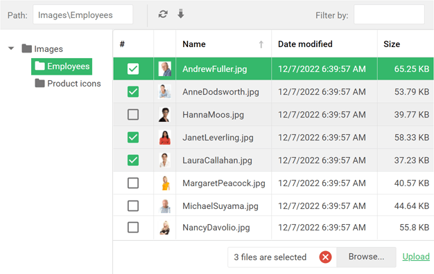 Once you integrated our File Manager control into your web app, your users can modify folder structures, browse, search, select, upload, download, rename, move, copy, delete files and folders.