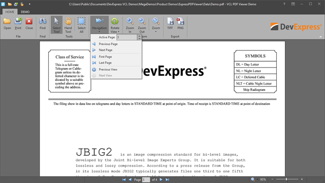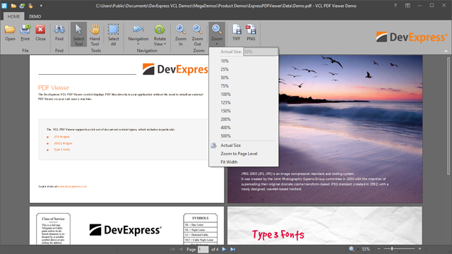 Just like Adobe's PDF Reader, you can zoom in and out of a document when using the DevExpress PDF Viewer via Ribbon buttons, pinch & zoom touch gestures, mouse scroll wheel or keyboard shortcuts. Alternatively, you can use zoom factors such as Actual size, zoom to page, fit to width and any custom zoom level (%). For proper page orientation when viewing a PDF document, the PDF Viewer includes both a Rotate Clockwise and Rotate Counterclockwise commands.