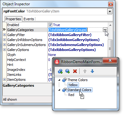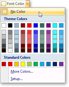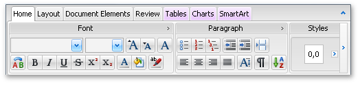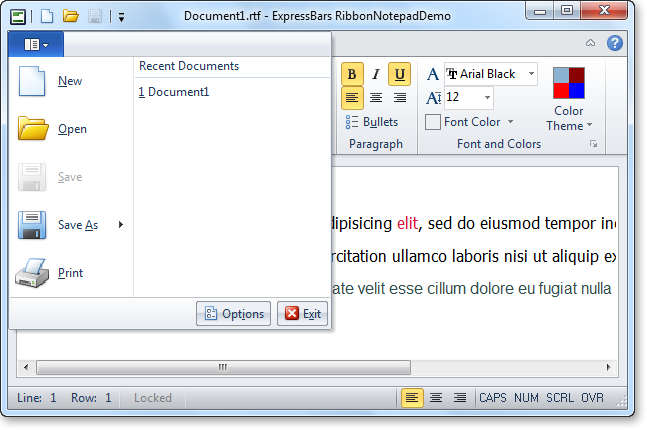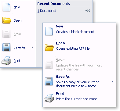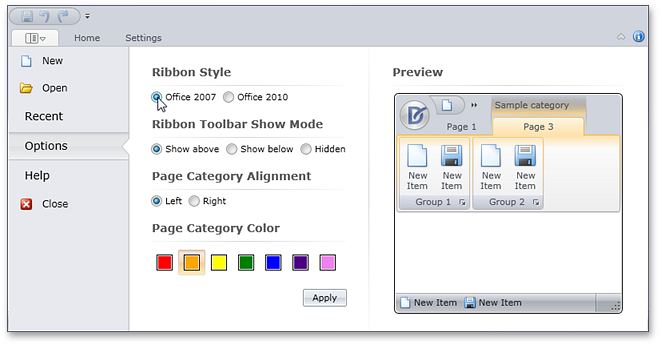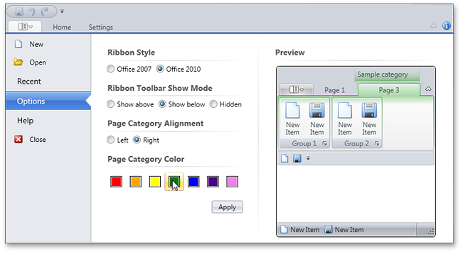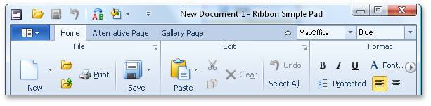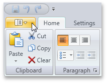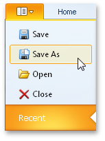 The Ribbon control supports multiple color schemes which affect the appearance of the Application Button and BackStageView Control (when used as a menu within the Ribbon).