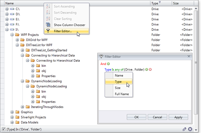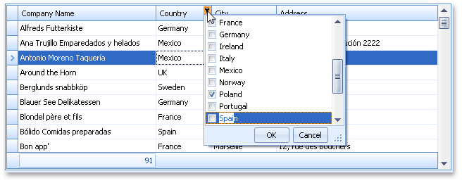 Whether you choose to use regular or checked filter dropdowns for individual columns, you can now use the incremental search feature to locate values in dropdown lists. Simply enter the required value in order to locate it in the list. When typing, the text is highlighted in the list making it easy to locate: