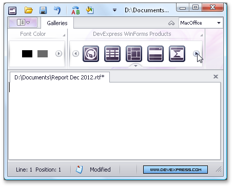 Microsoft's new MacOffice Ribbon Style can now be emulated using the DevExpress WinForms Ribbon Control.