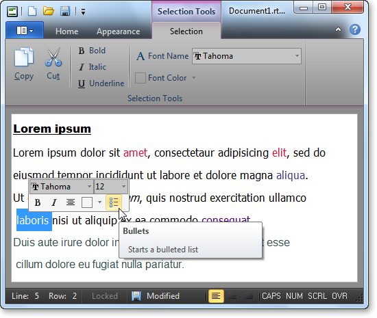 You can display any commands within the mini toolbar (regular, checked, and split buttons, editors, galleries, etc). The opacity of the toolbar is dependent upon the distance of the mouse cursor from the toolbar's bounds: the closer in, the more opaque; the further away, the more transparent. At some predefined distance, the toolbar becomes completely hidden. We have provided dedicated properties to allow you to customize these opacity options.