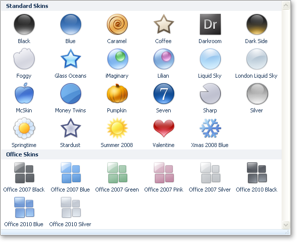 Click on a skin name below to view its appearance when applied to an application built with DevExpress controls.