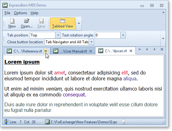 We have developed the new WinForms Document Manager component to help improve the tabbed user interface in your MDI applications. It includes numerous benefits when compared with the older XtraTabbedMdiManager. First, you can choose whether to present MDI child windows as a native MDI or a tabbed user interface. The tabbed user interface emulates that of Microsoft Visual Studio 2010: