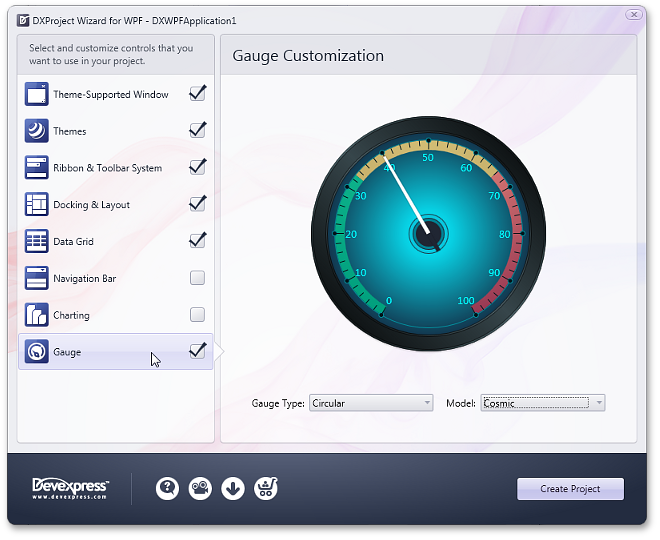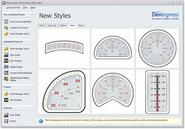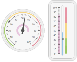 DevExpress WinForms Gauge Controls now support our WinForms look-and-feel system - Gauge background and border colors are automatically altered to match the characteristics of the appropriate skin. You can also control whether a Gauge control maintains its own look-and-feel or uses application-wide skin settings.