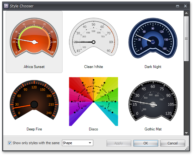 With this release, we've added a Style Chooser dialog for our WinForms Gauge Controls. This new dialog allows you to quickly change the current gauge style (its shape, theme, or both).