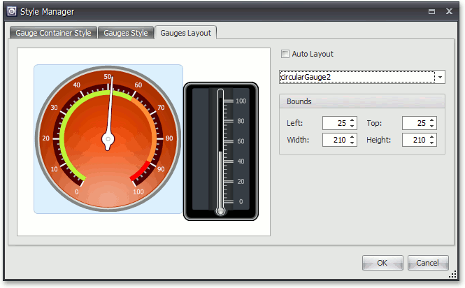 The Style Manager dialog is designed to control all gauge styles within a gauge container and to define associated layout settings.