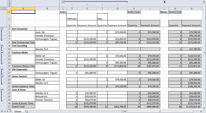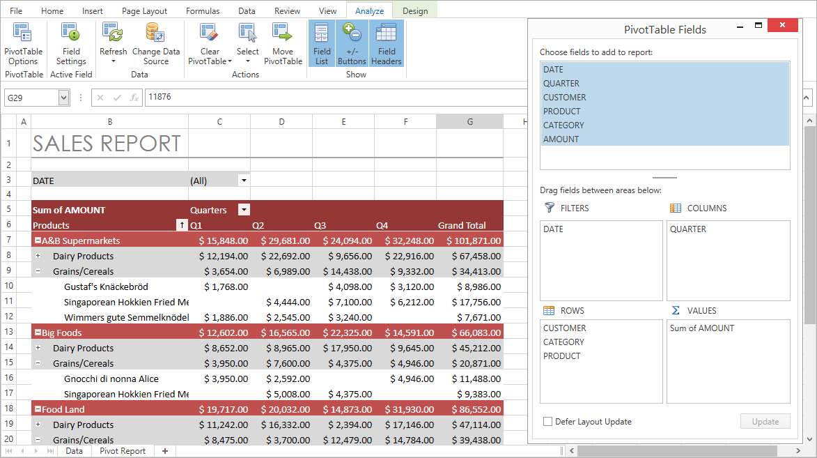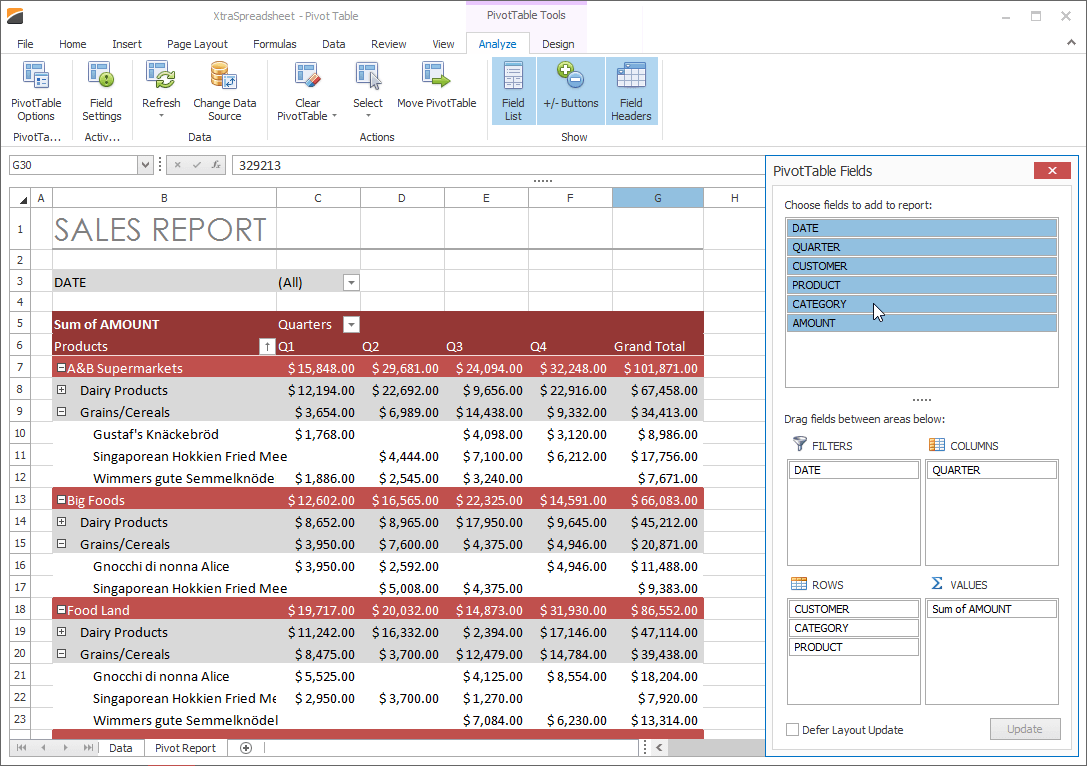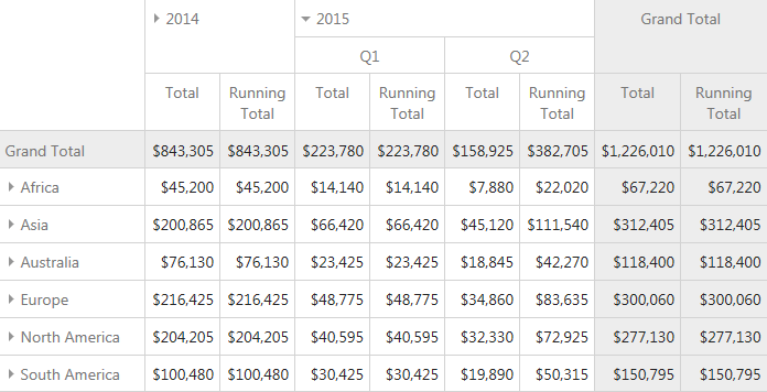With v15.2, you can export pivot grid data to Excel for further data analysis, using a simplified layout and without style information. The resulting worksheet includes outlined groups and frozen panes to make browsing the exported data simple. You can optionally highlight totals or hide field headers and/or cell borders in the worksheet.