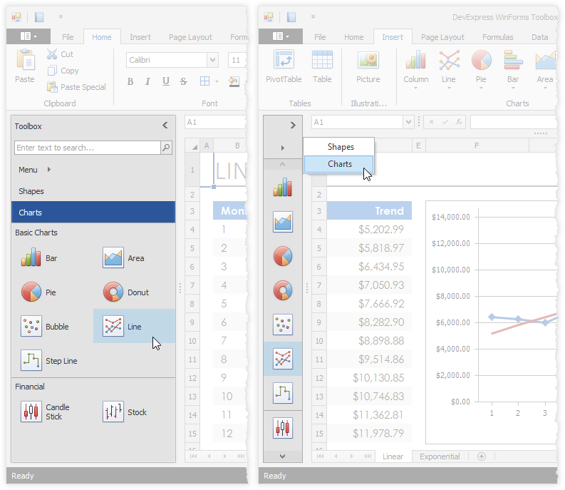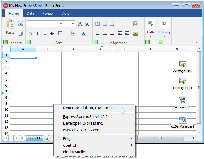 Creating a Ribbon or Toolbar UI for your Spreadsheet or Rich Edit control is now a breeze with a new design-time capability. Simply click the corresponding item in the control's context menu, select your preferences in the opened dialog, click OK and a few moments later a ready-to-use action-based UI has been added to your app.