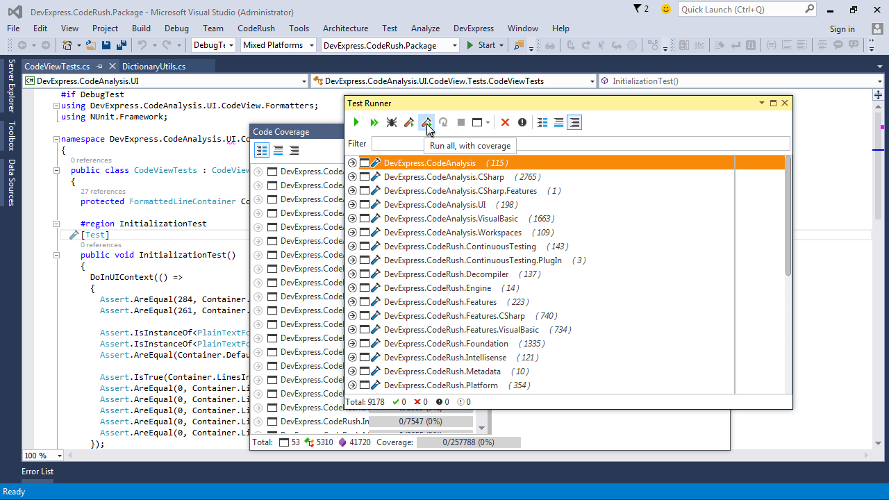 Now you can export code coverage statistics to XML, HMTL, and an NDepend-compatible format. CodeRush for Roslyn also now collects and presents coverage information for MSTest unit tests.
