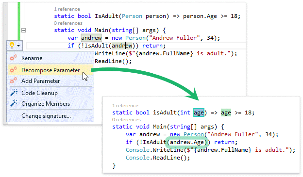 For example, if a method accepts a Person instance but only references that Person's Age property, Decompose Parameter will change that method signature and update all calling sites, so only the Age is passed in.