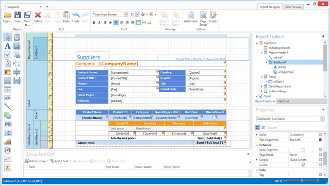 In this version, you can group report data by values of one or more dataset fields and provide header and footer sections for each group.
