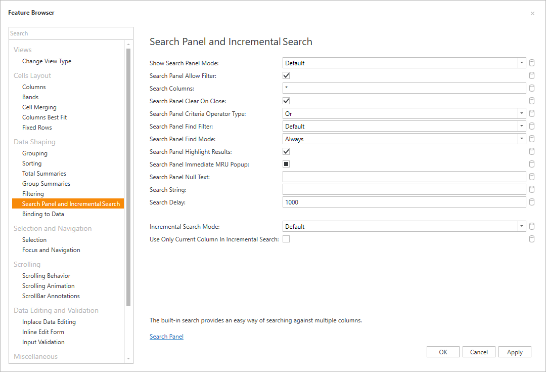 The data controller now allows users to build filter conditions with the Contains, NotContains, BeginsWith, and EndsWith comparison operators. This capability is available across all our controls that provide a data controller, including the Grid, Vertical Grid, Pivot Grid, and data-aware editors.