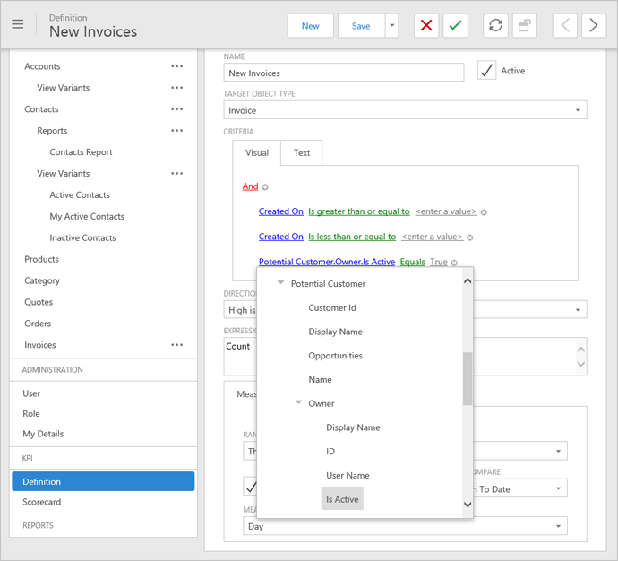 - The second tab allows you to create a filter expression using a set of filter operators (Equals, Between, Contains, etc.).