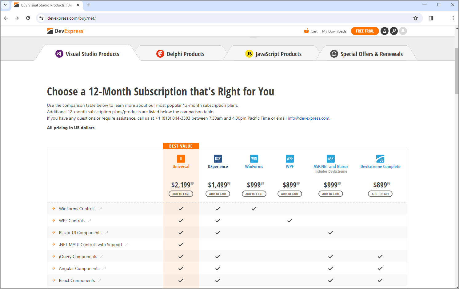 You can compare DevExpress product subscriptions and select the one that is most appropriate for your business needs by visiting our Purchase page at www.devexpress.com/buy.
