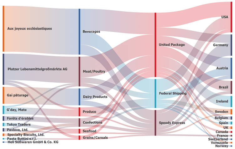 The DevExpress Sankey Diagram requires multi-category data - a dataset that contains a source field, a target field, and a weight field. These different variables within the dataset serve as the different nodes within the diagram. The Sankey Diagram control supports the following data sources:
